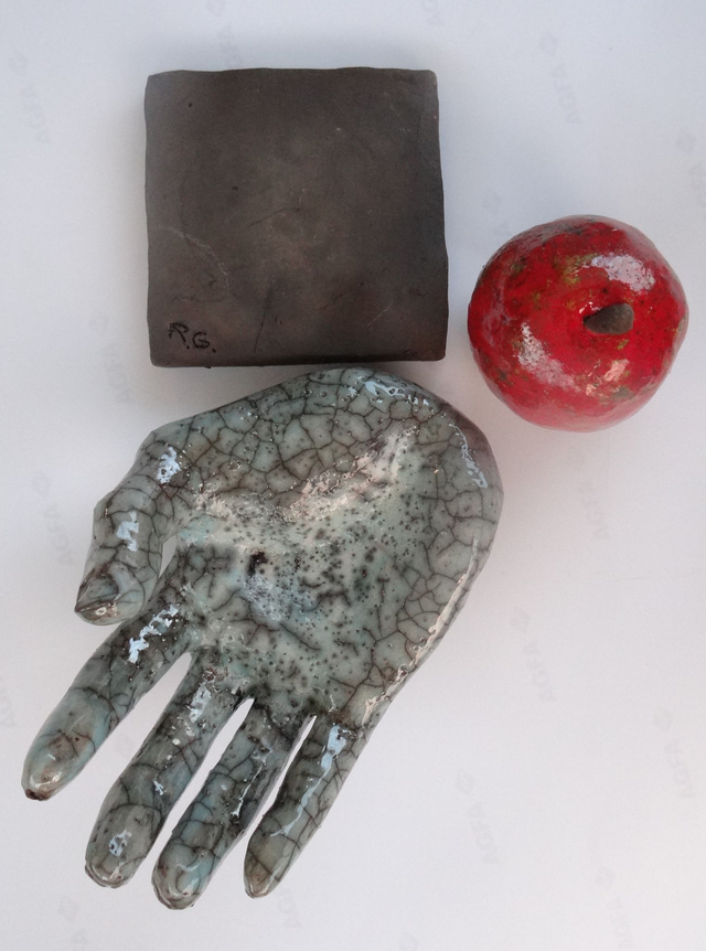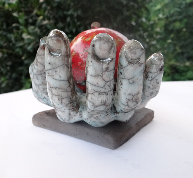 Trois éléments : le socle, la main à taille humaine réelle, la pomme rouge. Cuisson Raku